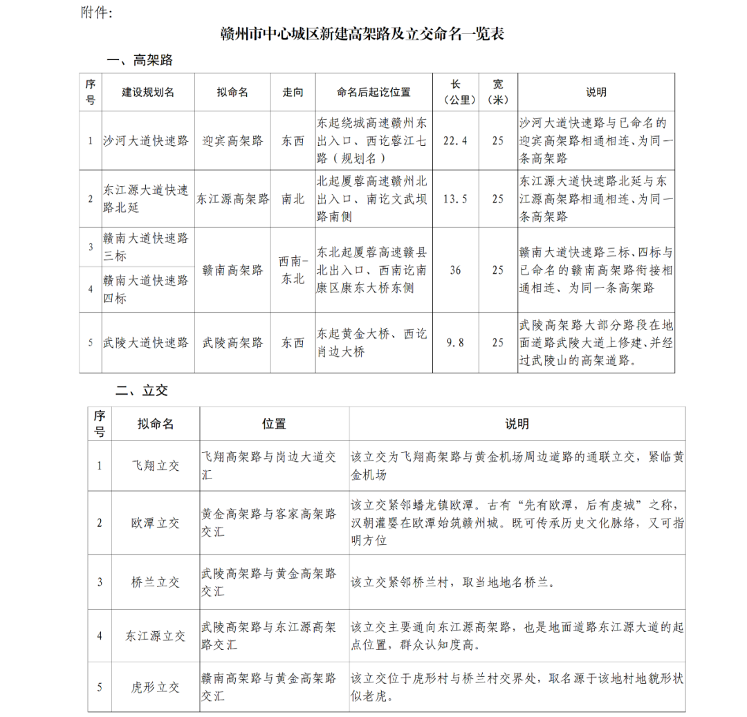 附件:1.赣州市中心城区新建高架路及立交命名一览表