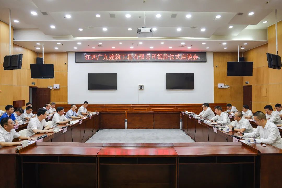 座谈会后举行了江西广九建筑工程有限公司揭牌仪式。梁湖清、容长贵、陈琪、袁立共同为江西广九建筑工程有限公司揭牌。
