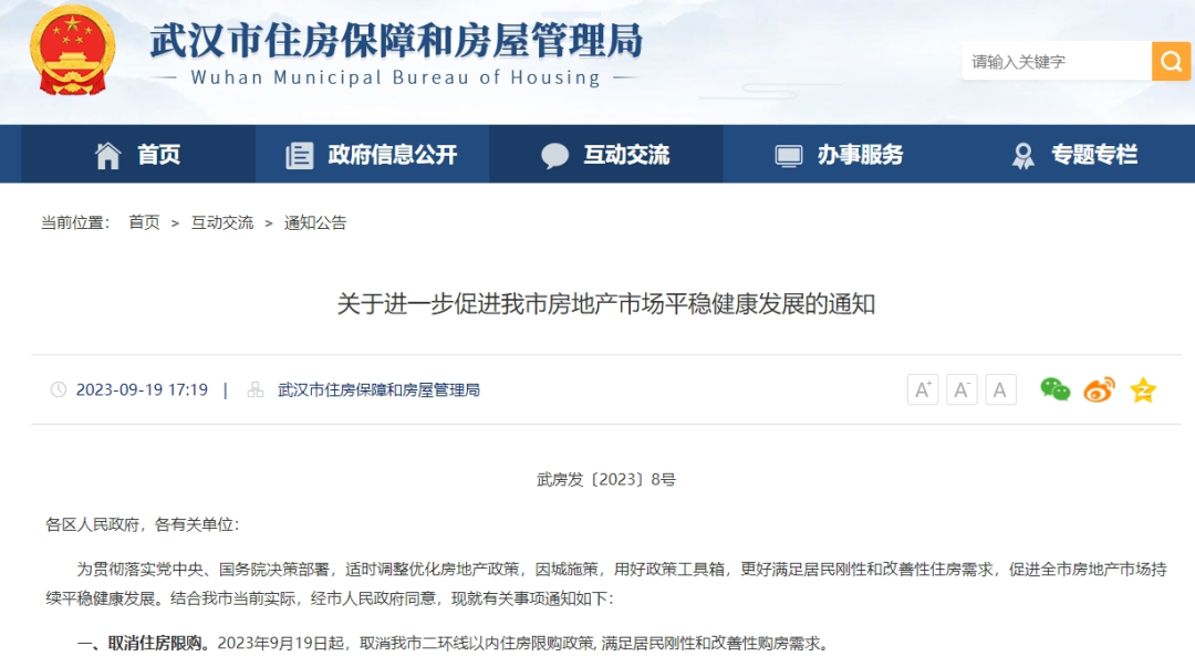 9月19日,武汉市住房保障和房屋管理局等六部门联合发布《关于进一步促进我市房地产市场平稳健康发展的通知》,包括全面取消限购、支持多孩家庭购房、设立房企白名单等十条措施。