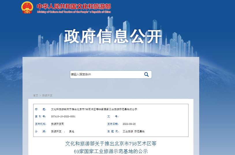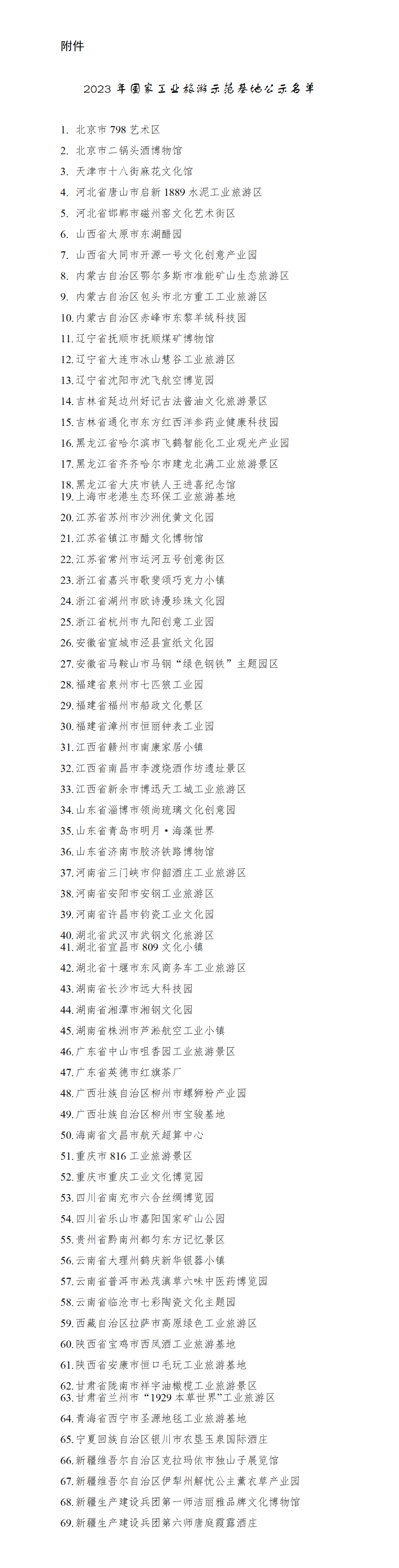 根据《国家工业旅游示范基地规范与评价》行业标准,经各省(区、市)文化和旅游行政部门推荐,文化和旅游部按程序组织专家评审,拟推出北京市798艺术区等69家国家工业旅游示范基地,现予以公示。具体名单详见附件。公示期为2023年9月25日至9月29日。公示期内若对公示单位有异议,可通过电子邮件或传真提出意见,电子邮箱地址:ziyuanchu@mct.gov.cn;传真:010-59882583。
