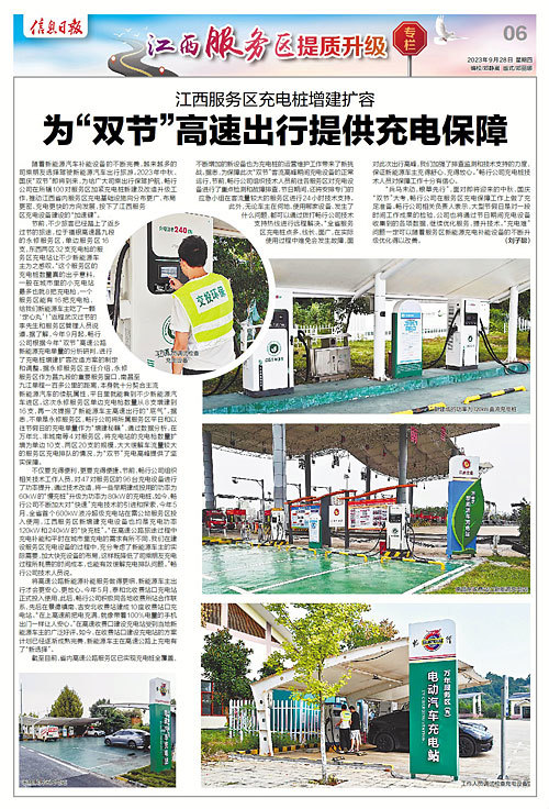 随着新能源汽车补能设备的不断完善,越来越多的司乘朋友选择驾驶新能源汽车出行旅游。2023年中秋、国庆“双节”即将到来,为给广大司乘出行保驾护航,畅行公司在所辖100对服务区加紧充电桩新建及改造升级工作,推动江西省内服务区充电基础设施向分布更广、布局更密、充电更快的方向发展,按下了江西服务区充电设备建设的“加速键”。