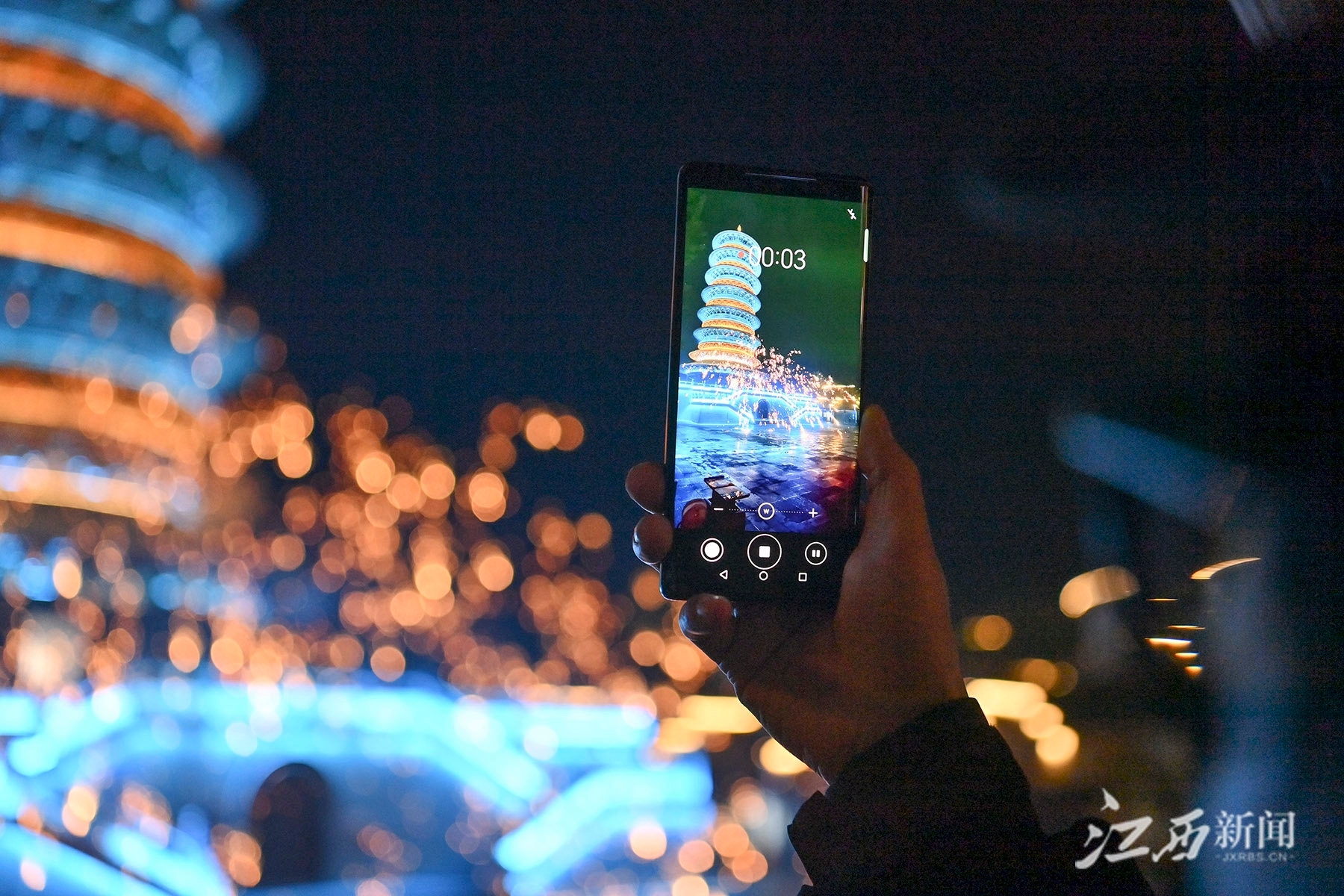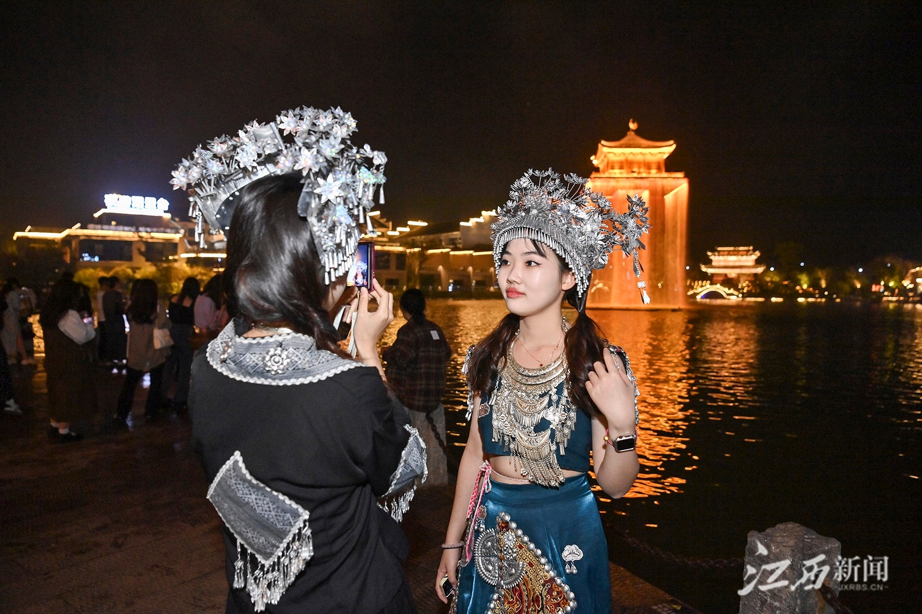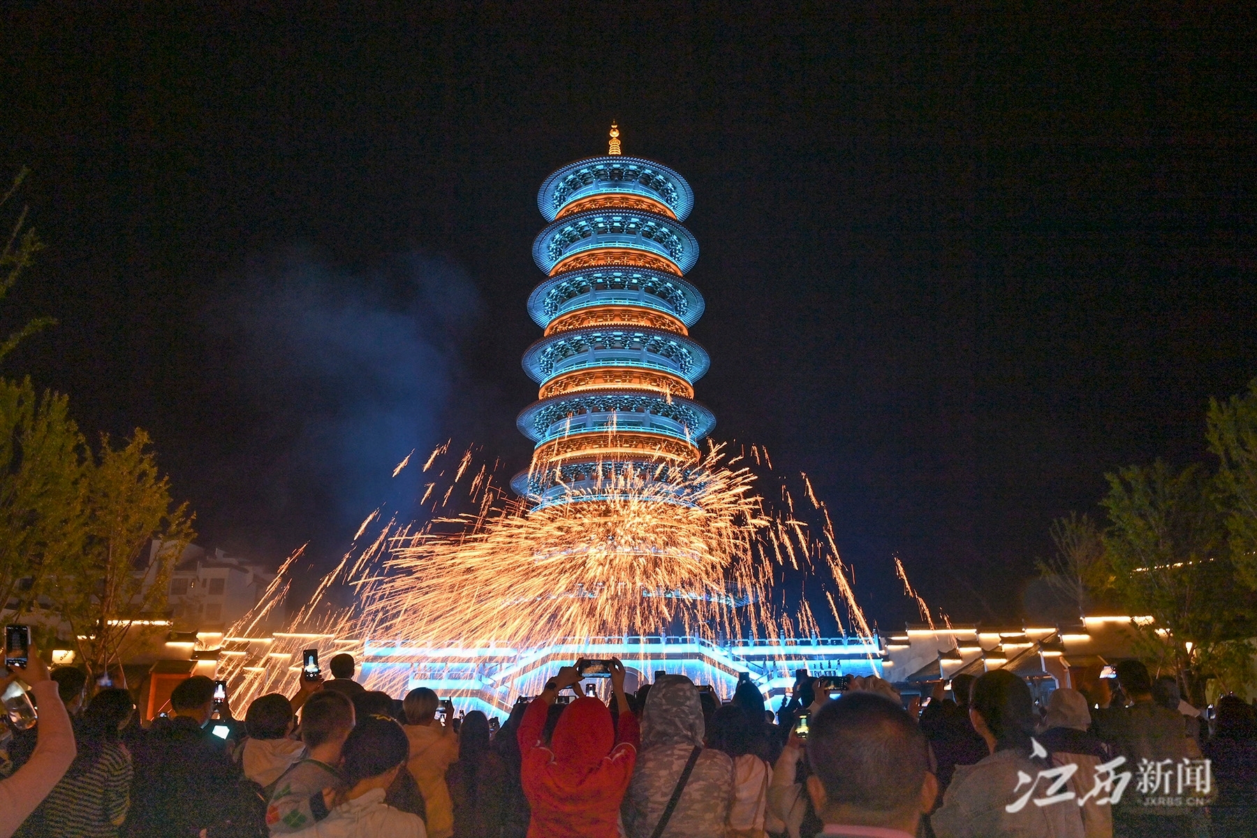 江西新闻客户端讯(江西日报全媒体记者李劼)10月9日晚,婺源县的婺女洲度假区流光溢彩,不少游客在抱玉塔前观看非遗打铁花表演和灯光秀《天工开物》,在摇橹船夜游码头打卡拍照,体验“满船清梦压星河”的浪漫诗意之美。
