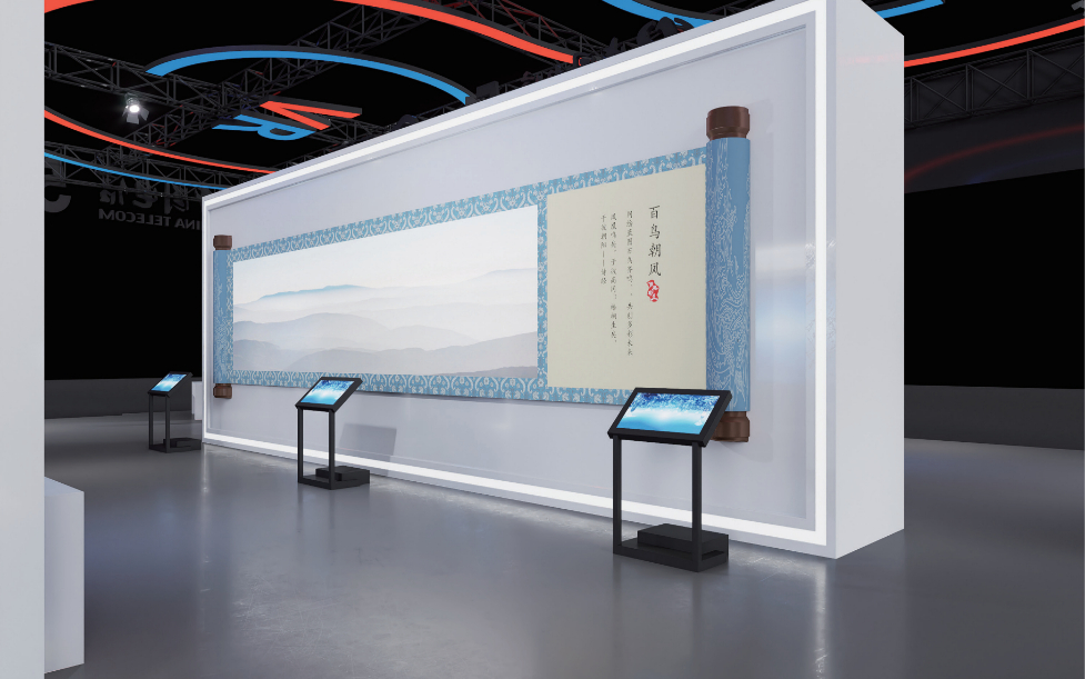 在百鸟朝凤展台,中国电信运用数字交互艺术融合中国经典纹饰,打造了一幅交互式中国经典数字艺术的精美长卷,观众们可以通过交互屏幕将自己绘制的飞鸟融入中国经典艺术作品当中,沉浸式体验穿越千年共创、共生、共融的乐趣。