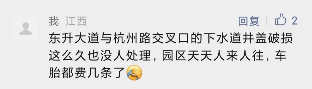 近日,有网友在东乡发布留言:“东升大道与杭州路交叉口的下水道井盖破损这么久也没人处理,园区天天人来人往,车胎都费几条了。”