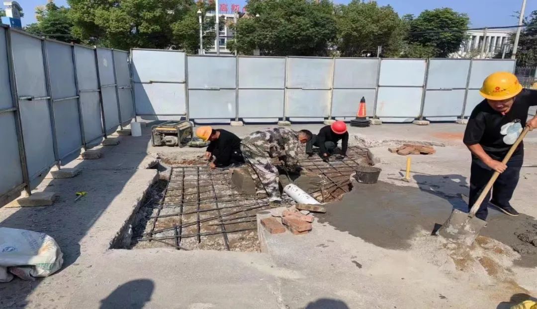 10月13日,东乡经开区有关工作人员联系工投建筑安装工程有限公司的工人进行现场施工。今天,井盖已换新,塌陷水泥地及周边破损路面也已精心修补好。