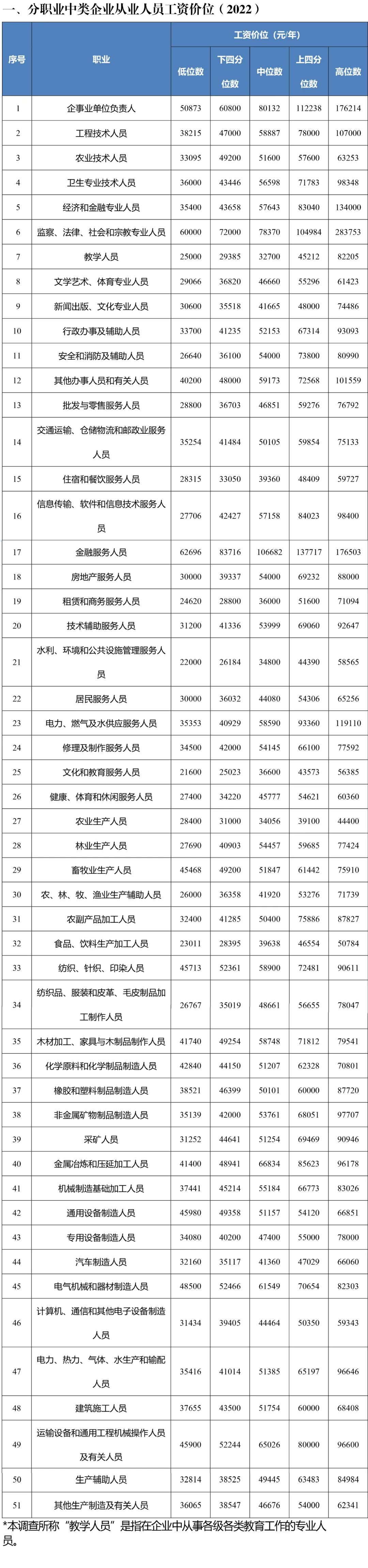 一、本次发布的劳动力市场工资价位内容主要包括不同职业企业从业人员工资价位、不同岗位等级企业从业人员工资价位数据。