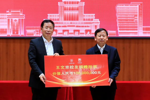 王文京校友深情表达,感谢学校的关怀,很荣幸在母校建校100周年这个历史时刻,通过捐赠持有的用友科技股份有限公司股票表达对母校的感恩,力争为学校教育发展事业做出贡献,衷心祝愿学校发展能得到更多校友持续的关心和支持,不断取得更好更大的发展,在学校百年的新起点、新阶段有更高的目标,朝着更领先的财经大学的方向发展,衷心祝愿学校新阶段的发展更加辉煌,表示将持续关心和助力学校的发展。
