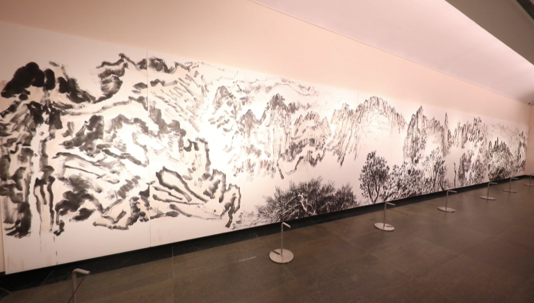 以宜春明月山为主题的巨幅水墨作品《明月山》被放在了第三展厅内的“境·非境”部分。该画全长17.36米、宽2.48米,是罗一平4次前往明月山,经过半年多时间创作和反复修改后,在今年完成的一幅巨型山水画。