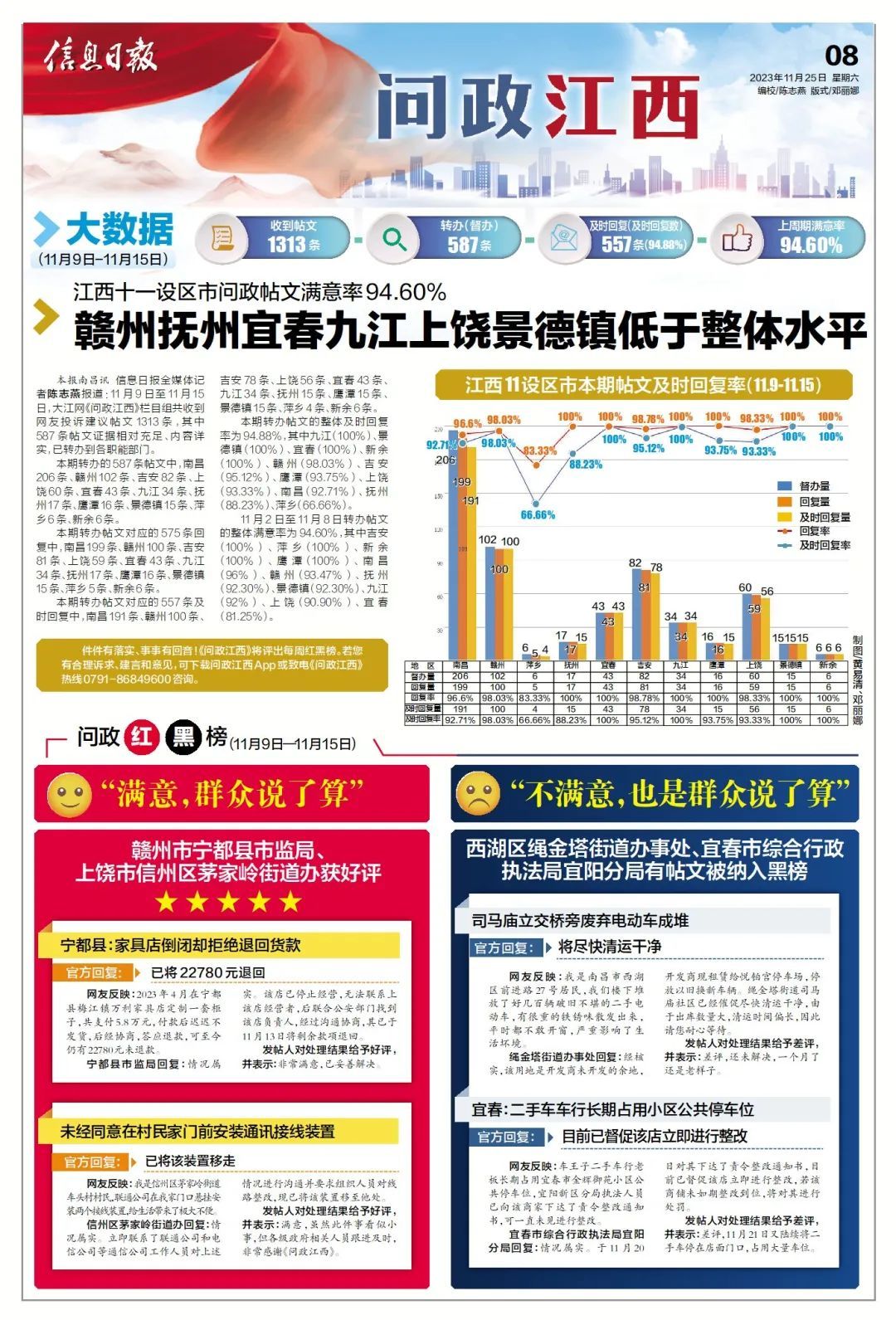 11月2日至11月8日转办帖文的整体满意率为94.60%,其中吉安(100%)、萍乡(100%)、新余(100%)、鹰潭(100%)、南昌(96%)、赣州(93.47%)、抚州(92.30%)、景德镇(92.30%)、九江(92%)、上饶(90.90%)、宜春(81.25%)。