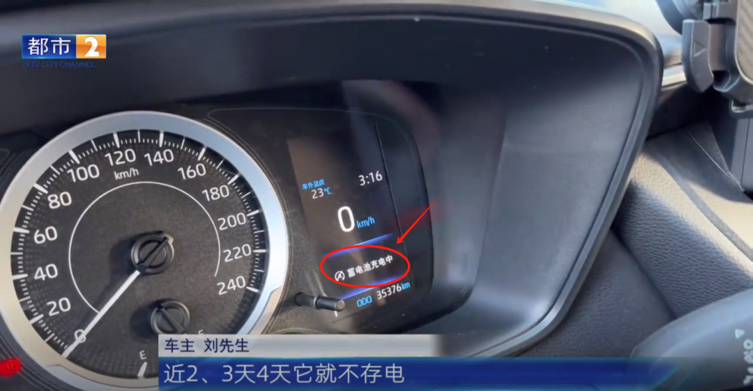 刘先生的这辆卡罗拉在行驶过程中,中控屏幕上时不时就会提示“蓄电池充电中”。刘先生表示,最近这段时间,这辆车因为蓄电池的缘故,已经在半路“趴窝”了多次。
