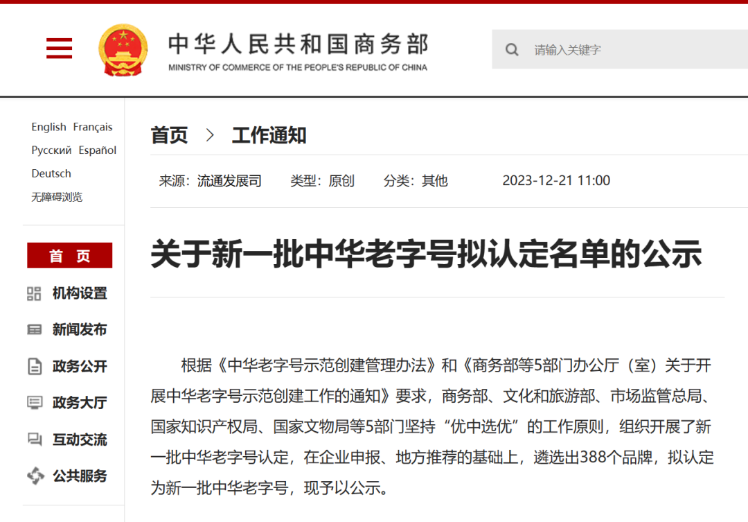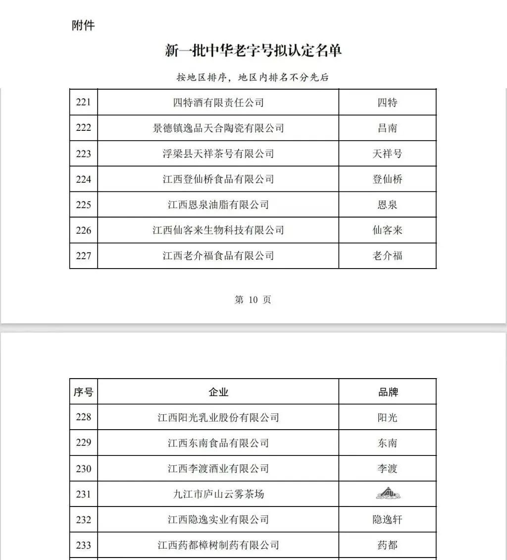 今日,商务部公示了新一批中华老字号拟认定名单,江西省四特、昌南、天祥号、登仙桥、恩泉、仙客来、老介福、阳光、东南、李渡、庐山、隐逸轩、药都共13个老字号名列其中(排名不分先后)。