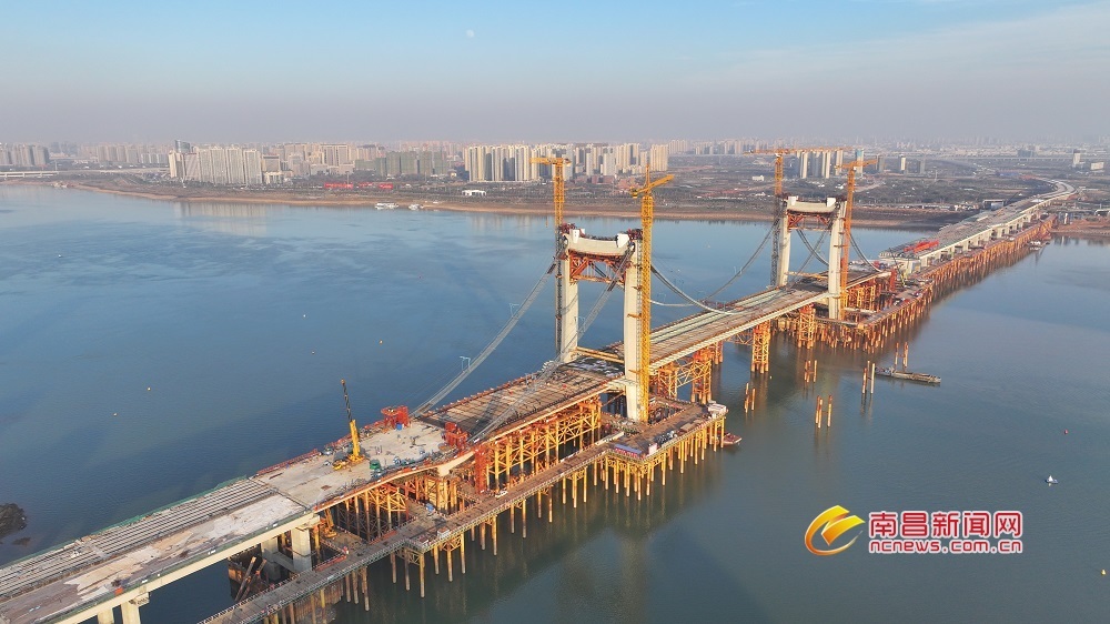 目前,洪州大桥已进入主缆架设阶段,已架设34根索股,累计完成46%,承台工程完成199座,累计完成91.3%,墩台工程完成247个,累计完成88.2%,盖梁工程完成93个,累计完成83.8%,大桥过江主线计划今年年底结构贯通,2024年4月完成门塔建设,2024年9月全线通车。(全媒体记者 马悦 文/图)