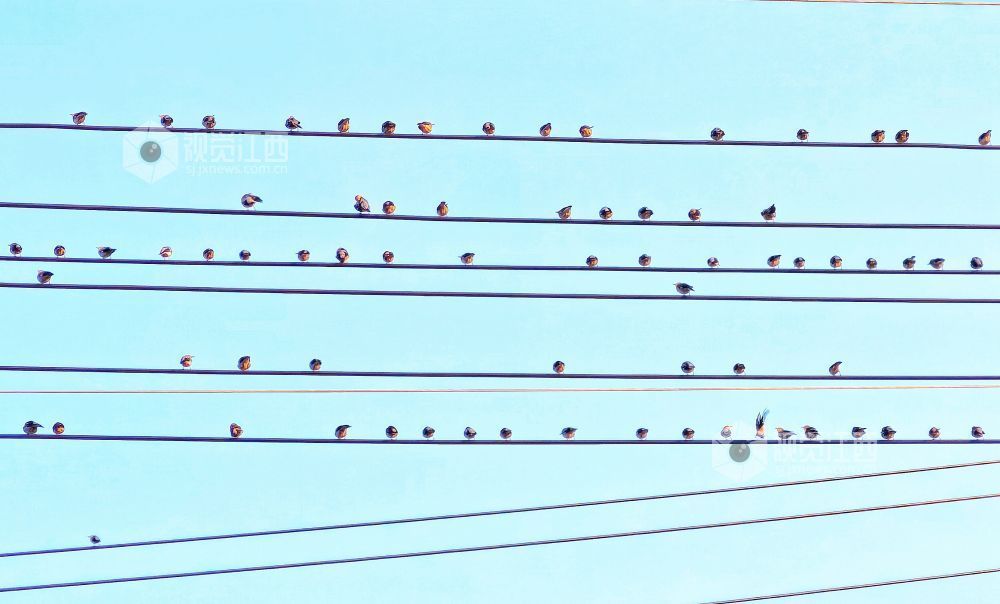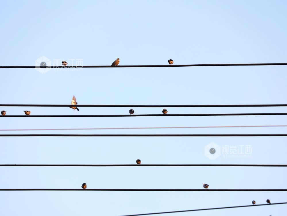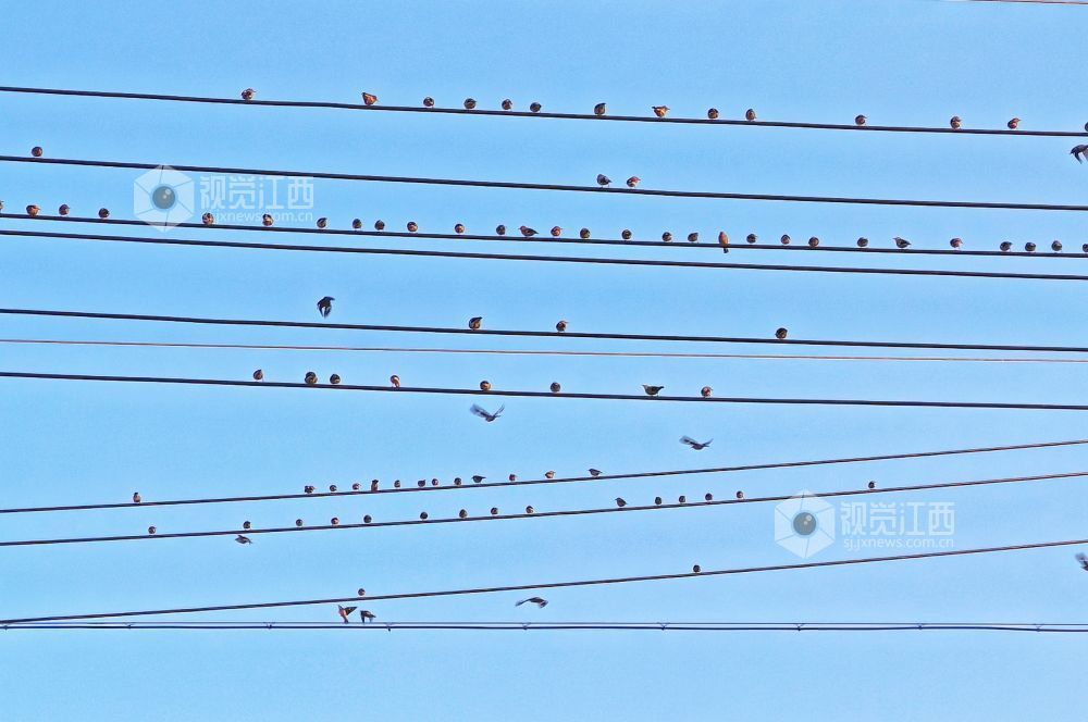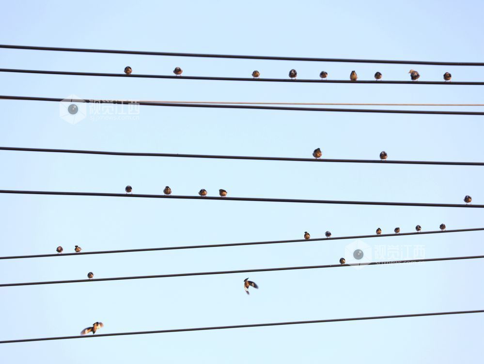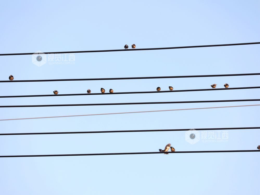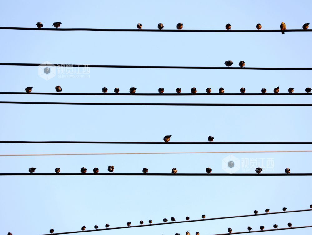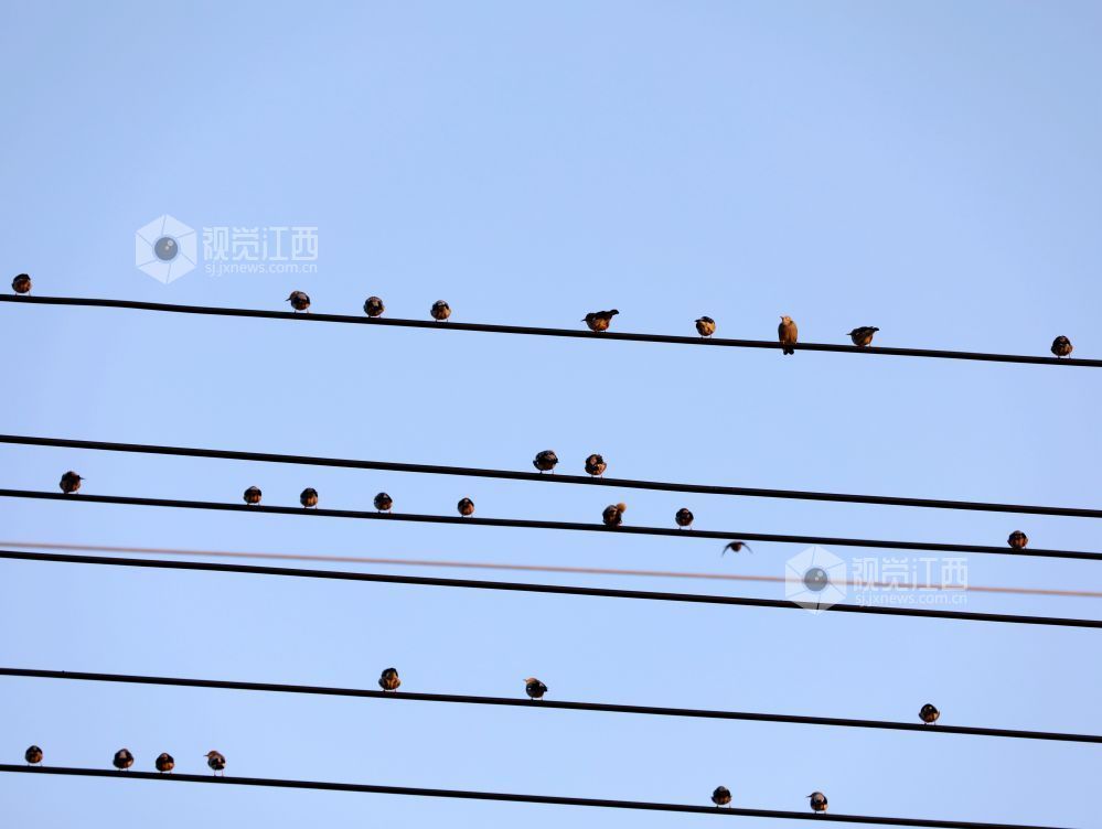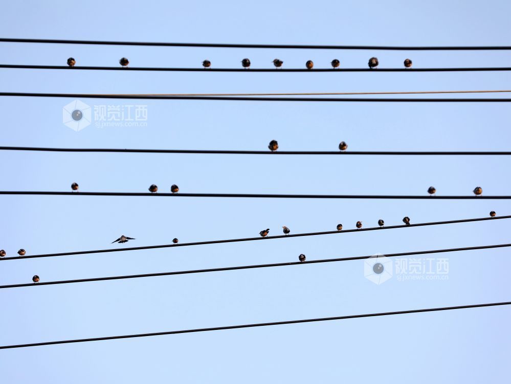 2023年12月30日,江西省分宜县第六中学校门口,一群小鸟时而停驻在电线上,时而栖息在校园大门的大铜字上,宛如五线谱上跳动的音符,奏响冬天的和谐乐章。