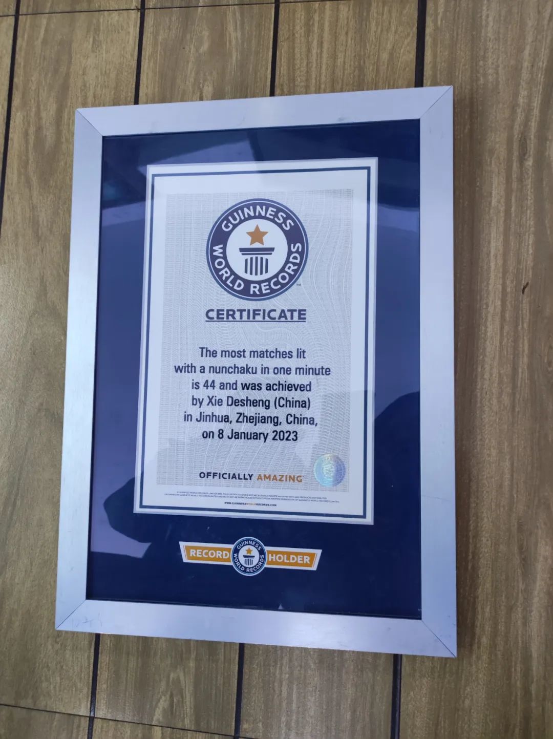 谢德胜在一分钟之内用双节棍成功点燃了48根火柴,挑战并刷新了之前他自己保持的一分钟之内用双节棍点燃44根火柴的世界纪录。