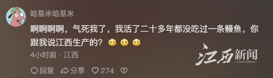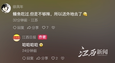 还有一生爱吃辣的江西人坚决不承认被老家“背刺”了:鳗鱼吃过,但是不够辣,所以送外地去了。