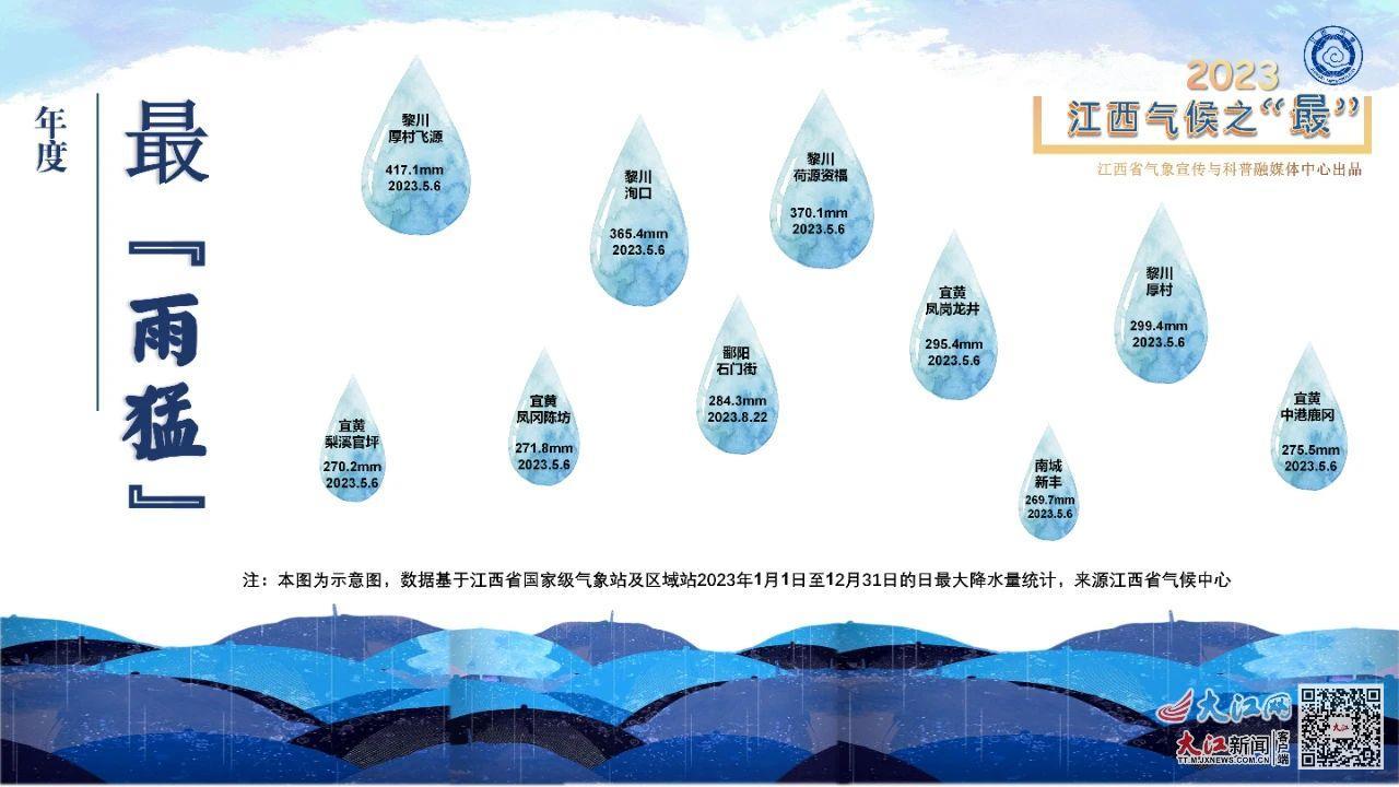 从江西省日降水量排名前十榜单可以看出:2023年单日降雨最猛的区域多出现在中部、东部地区,日降水量大于268毫米才是上榜的基本条件,其中黎川县飞源村一天下了417毫米,位居榜首。5月4-7日,全省有11个县(市、区)的56个测站先后出现特大暴雨,41个县(市、区)的385个测站出现大暴雨。此次暴雨过程极端性强,有6个县(市、区)日雨量突破月极大值,宜黄还突破了年极大值。2023年度日降水量排行前十的站点中,发生在5月6日的独占九席,正可谓“雨最猛”的一天。