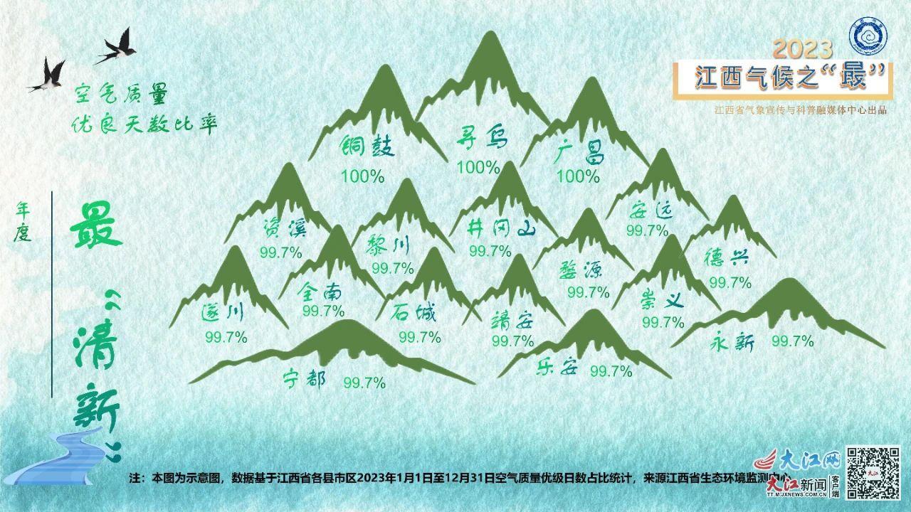 2023年江西省的最“清新”榜单中,寻乌、广昌和铜鼓等3县的空气质量优良日数占比均达到了100%,并列荣登榜首,接下来的竞争更是激烈,井冈山、婺源、靖安、资溪、德兴等14个县(市、区)同时以占比99.7%的成绩,紧随其后。