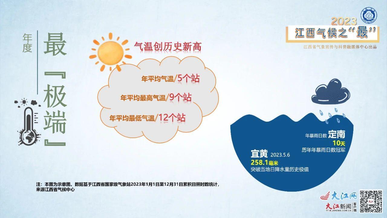 在气候变化的背景之下,全球极端天气气候事件呈现多发强发的态势,高温、低温、降水、雪深等历史极值都可能会被刷新纪录。在2023年江西年度最“突破”榜单上,全省有5个县(市、区)年平均气温、9个县(市、区)年平均最高气温和12个县(市、区)年平均最低气温创历史新高;宜黄县凭借5月6日258.1毫米的雨量突破当地日降水量历史极大值;定南县年暴雨日数达10天,也成功问鼎历年年暴雨日数。