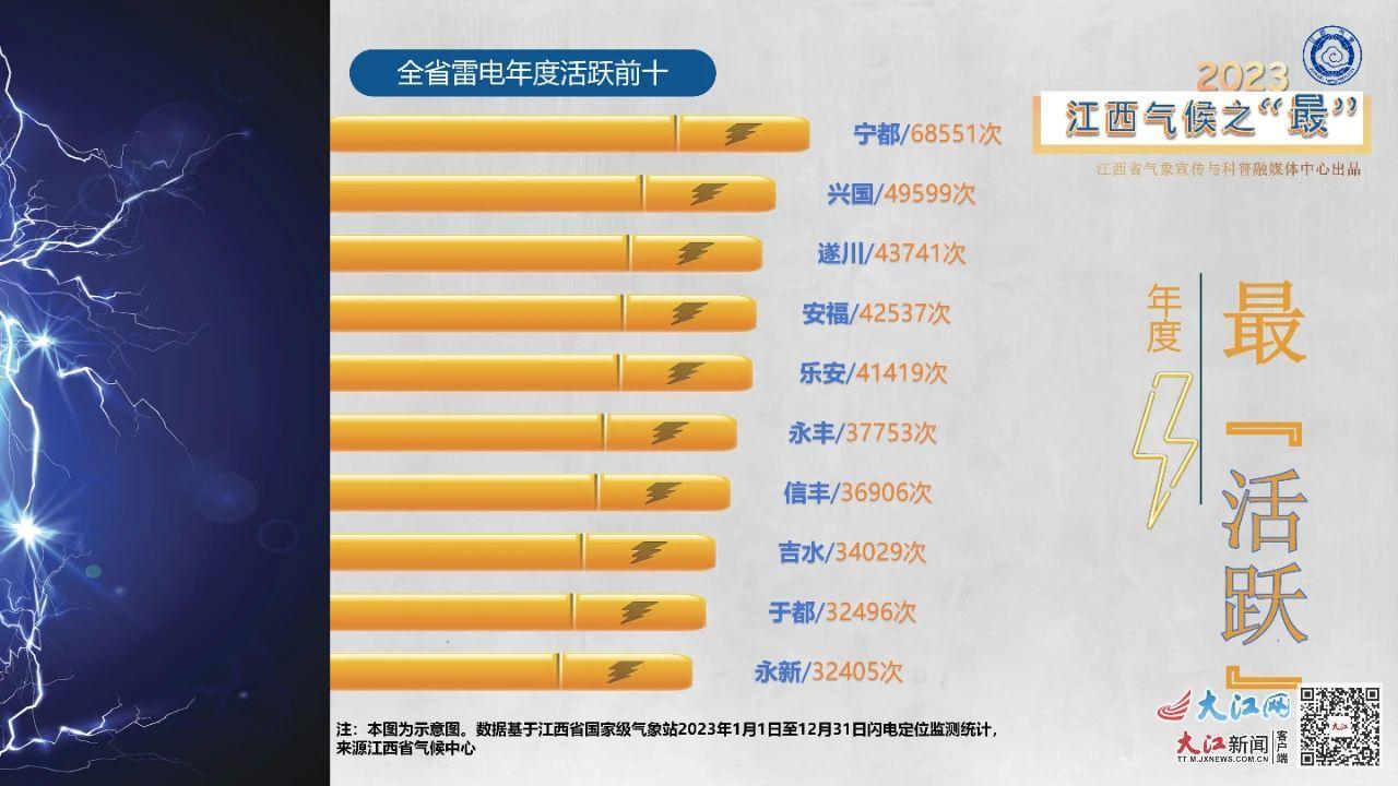 2023年3月24日-8月31日,全省共落雷146.6万次,是去年同期的1.94倍,雷电高发区主要出现在吉安、赣州、抚州、宜春、上饶等设区市。其中,2023年5月21日全省落雷次数高达10.2万次,创江西2003年有闪电定位监测记录以来单日落雷次数的最高纪录。全省雷电年度活跃榜,宁都以68551次荣登最“活跃”宝座,兴国和遂川分别以49599次和43741次,分坐其左右。