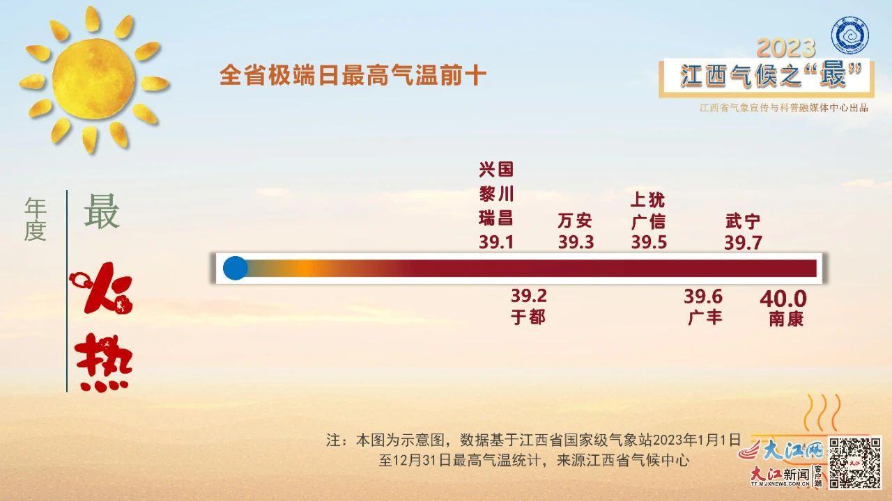 2023年度最“火热”排行榜上,江西吉泰盆地及赣南西部等地高温日数超过40天,其中上犹县高温日数共达61天,位列第1,赣县、萍乡以55天和54天,位列第2、3位。今年,江西有75%的县(市、区)极端最高气温超过38℃,以南康7月15日40.0℃位居全省最高,武宁和广丰紧随其后。此外,今年江西大范围高温出现时间早,5月27-30日全省有91个县(市、区)日最高气温超过35℃ ,其中60个县(市、区)日最高气温超过37.0℃;除上饶市东部和九江市北部,全省有75个县(市、区)最高气温突破本月历史极值创新高。