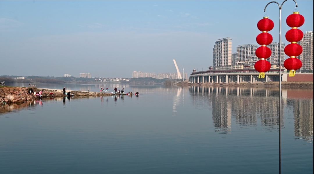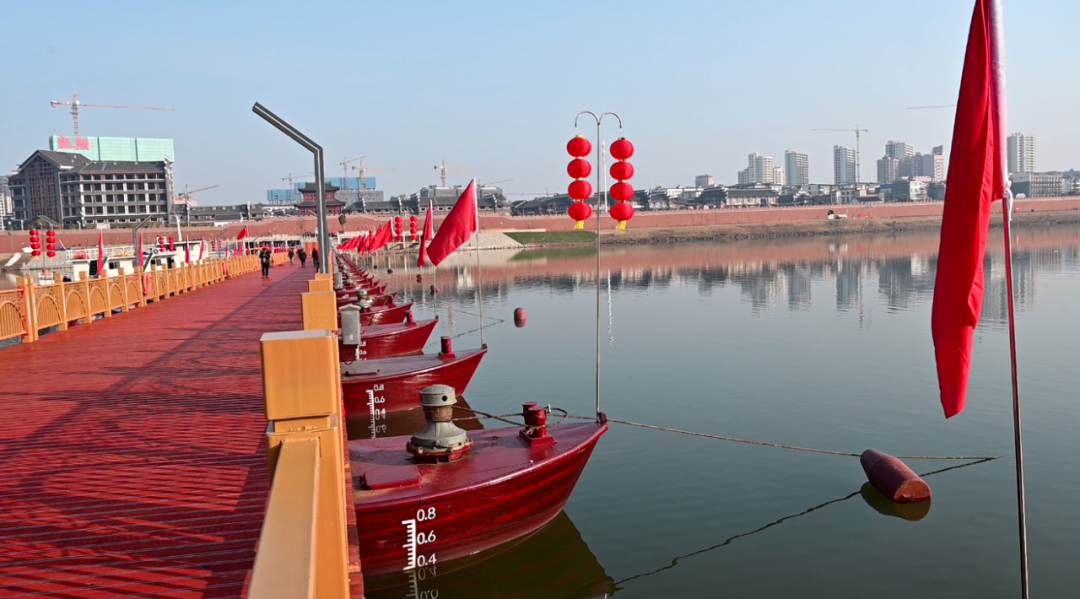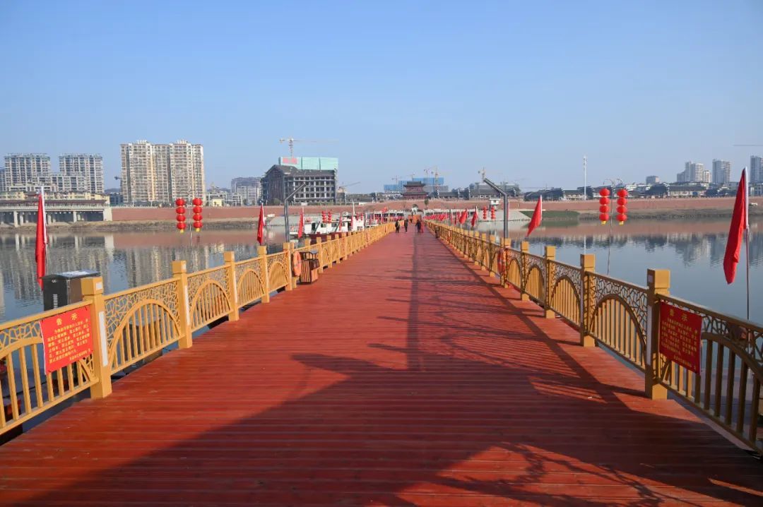 春节将至,浮桥两侧竖起了两列夺目的红旗和灯笼,与朱红色的桥干相映成辉。立于桥上放眼望去,抬头便是迎薰门,左右与信江大桥、贵溪大桥遥遥相望,一江两岸美不胜收。