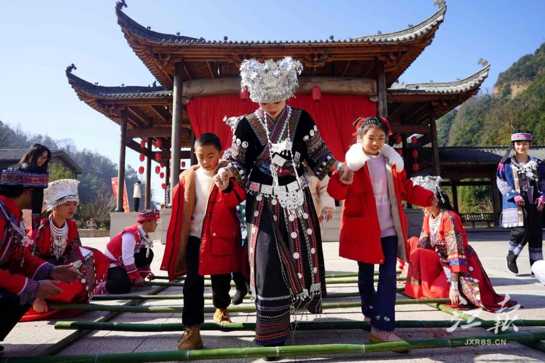 2月12日,乐安县的大华山蝶栖谷景区开展的“千古苗寨女儿城”主题活动中,游客们正在和苗族姑娘跳竹竿舞。