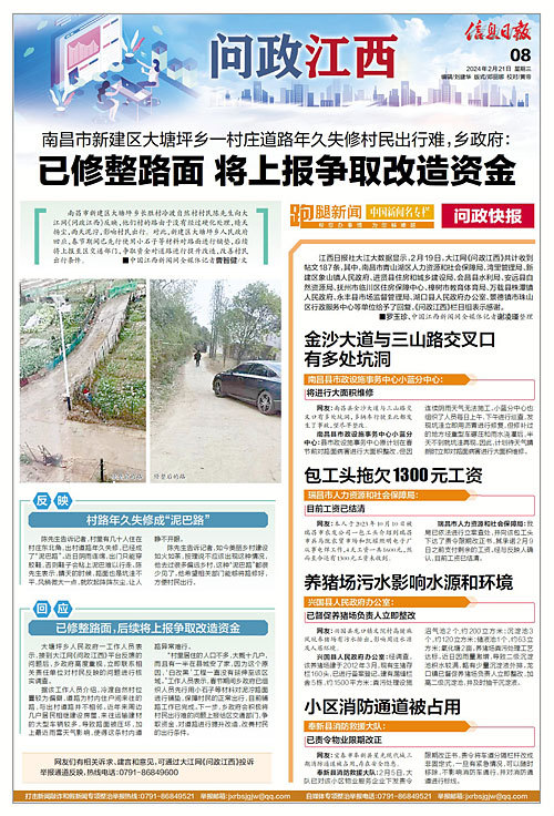 南昌县市政设施事务中心小蓝分中心:县市政设施事务中心原计划在春节前对路面病害进行大面积整改,但因连续阴雨天气无法施工。小蓝分中心也组织了人员每日上午、下午进行巡查,发现坑洼立即用沥青进行修复,但修补过的地方经重型车碾压和雨水浇灌后,半天不到就坑洼再现。因此,计划待天气晴朗时立即对路面病害进行大面积维修。
