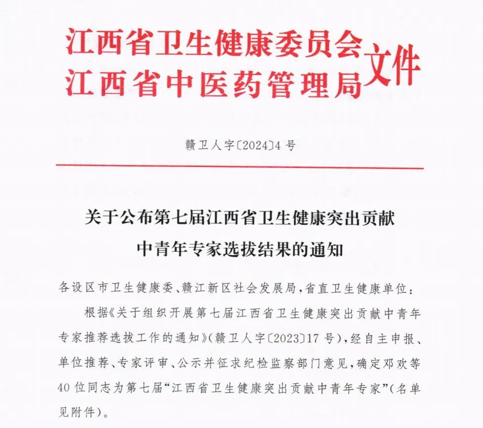 “江西省卫生健康突出贡献中青年专家”是由江西省卫健委牵头,经自主申报、单位推荐、专家评审及公示等环节进行评选的省级人才荣誉称号。获评人员是在全省卫生健康系统内从事医疗、预防、疾控、保健、科研及中医药等领域工作中作出贡献,创造出显著社会、经济效益的中青年专业人才,为促进全省卫生健康事业高质量发展、推动健康江西建设作出了突出贡献。