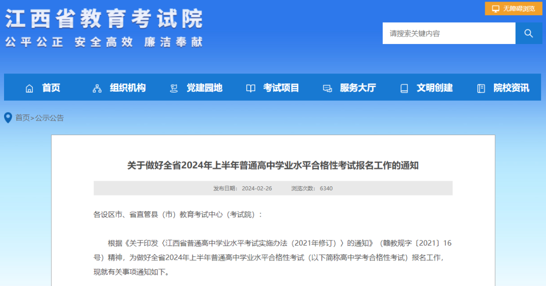 高中学考合格性考试成绩 一般于考试结束一个月后公布,考生可登录江西省教育考试院网站(www.jxeea.cn),进入“服务大厅”点击“成绩查询”栏目下的“高中学考合格性考试网上查询入口”查询当次考试成绩。需要开具高中学考合格性考试成绩证明的考生可在“服务大厅”点击“一键申请各类成绩证明”自助办理。