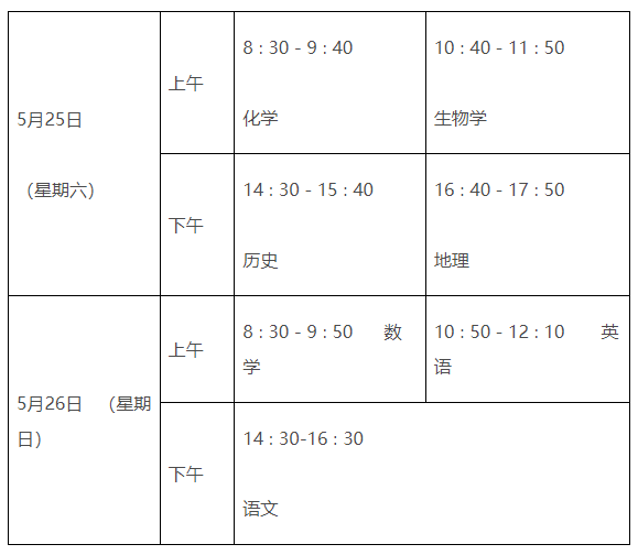 5月25日至26日考试。 本次考试全省统考开考科目为7科:语文、数学、英语、化学、生物学、历史、地理。