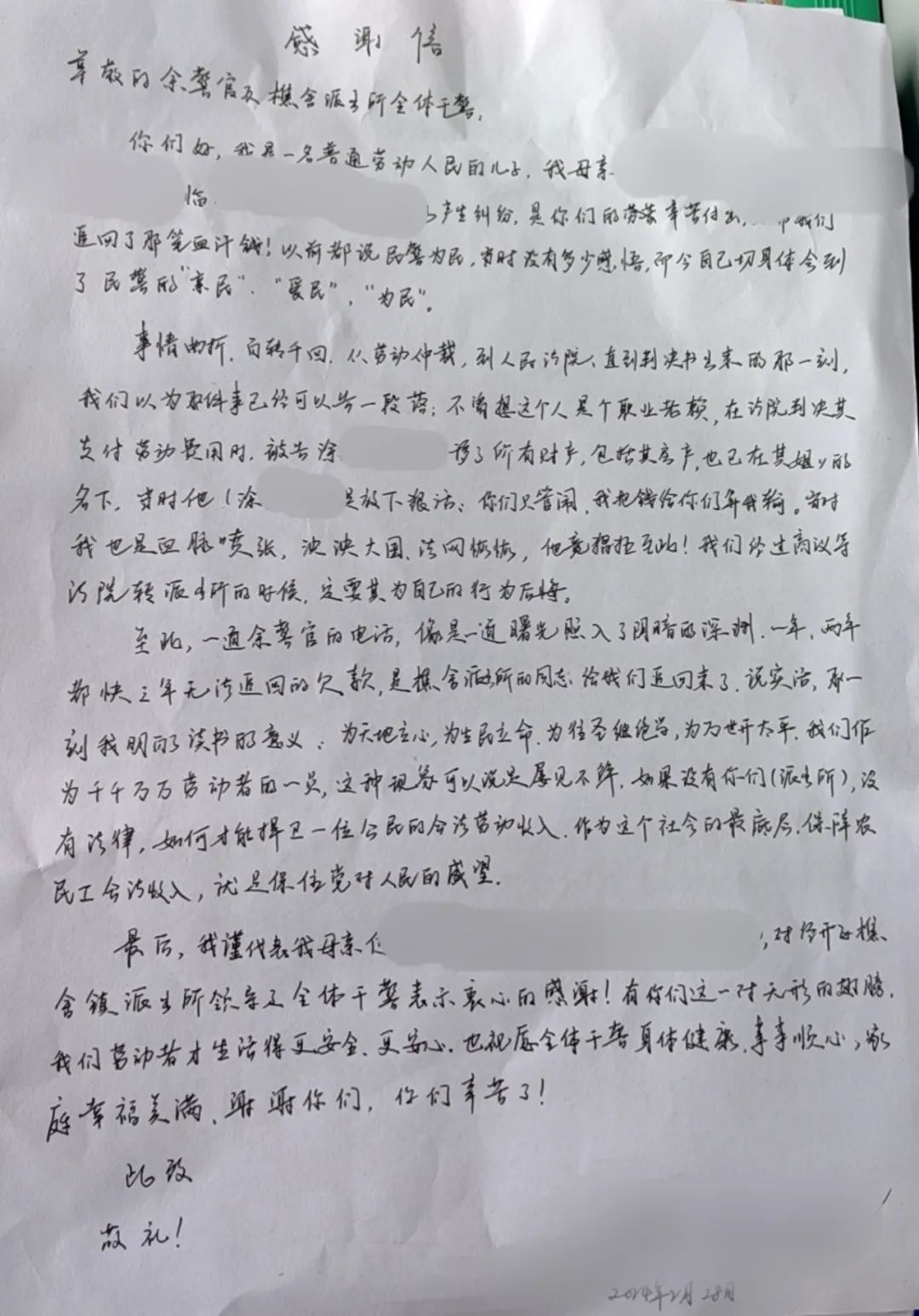 感谢民警帮他们讨回工