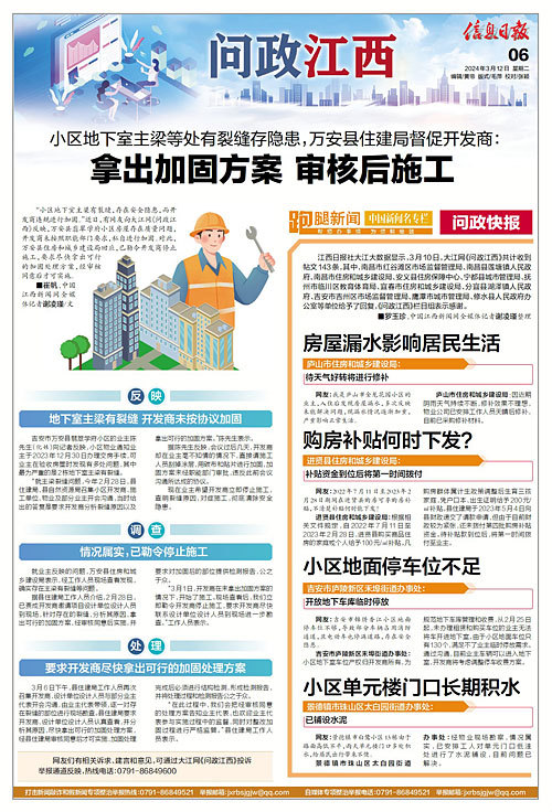 “小区地下室主梁有裂缝,存在安全隐患,而开发商违规进行加固。”近日,有网友向大江网《问政江西》反映,万安县翡翠学府小区房屋存在质量问题,开发商未按照职能部门要求,私自进行加固。对此,万安县住房和城乡建设局回应,已勒令开发商停止施工,要求尽快拿出可行的加固处理方案,经审核同意后才可实施。