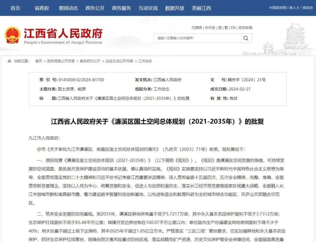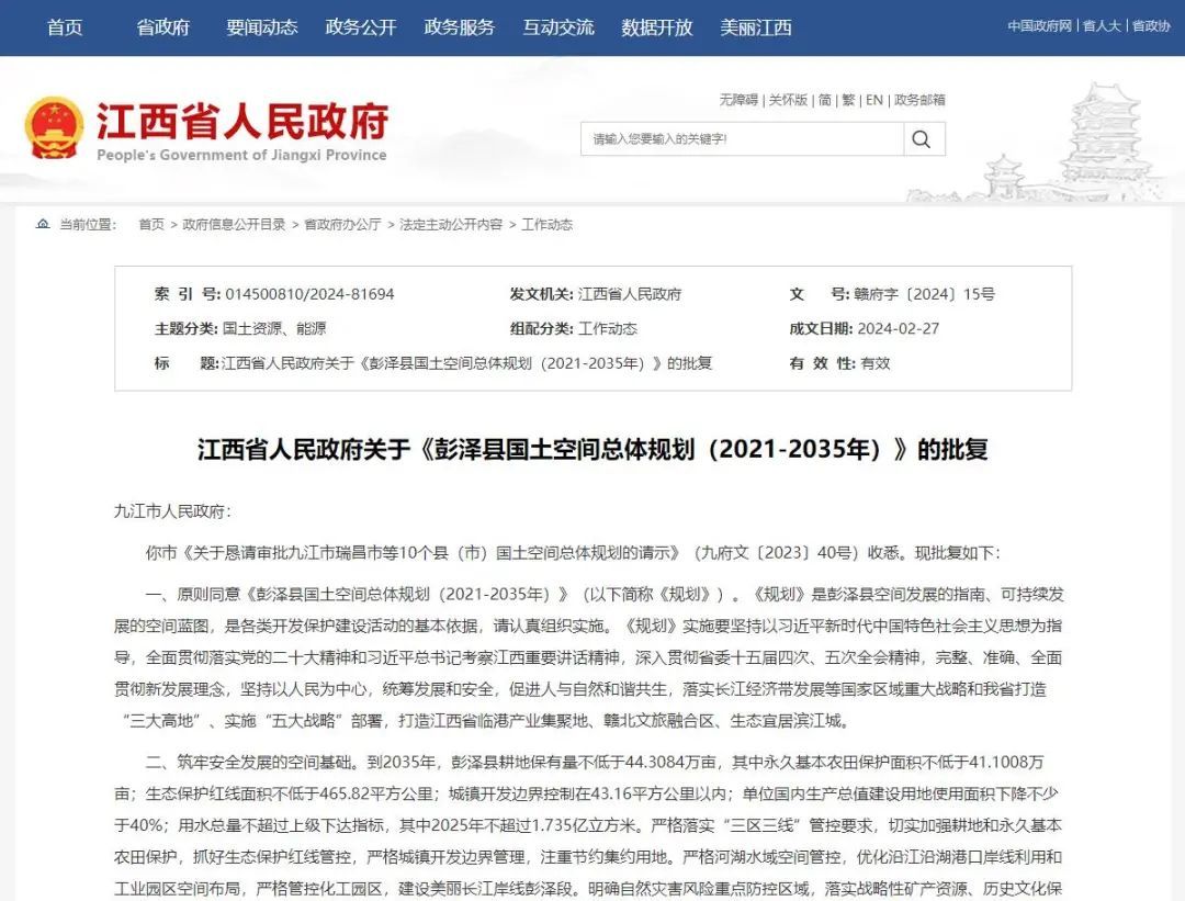 江西省人民政府关于《彭泽县国土空间总体规划(2021-2035年)》的批复