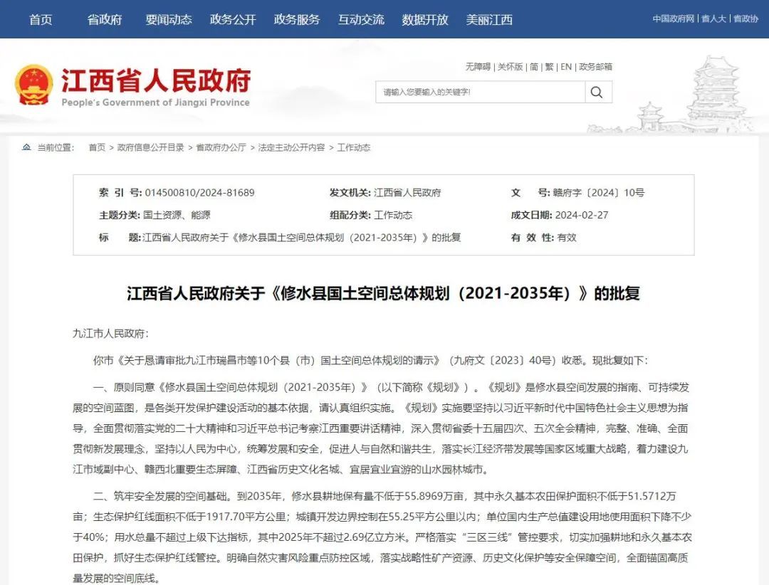 江西省人民政府关于《修水县国土空间总体规划(2021-2035年)》的批复