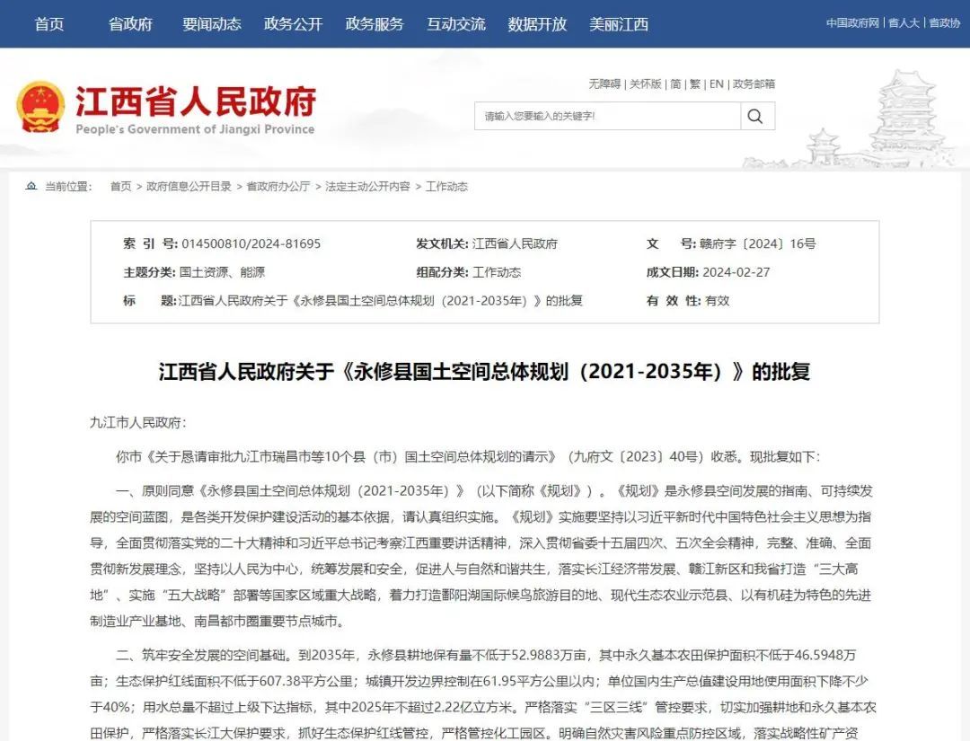 江西省人民政府关于《永修县国土空间总体规划(2021-2035年)》的批复