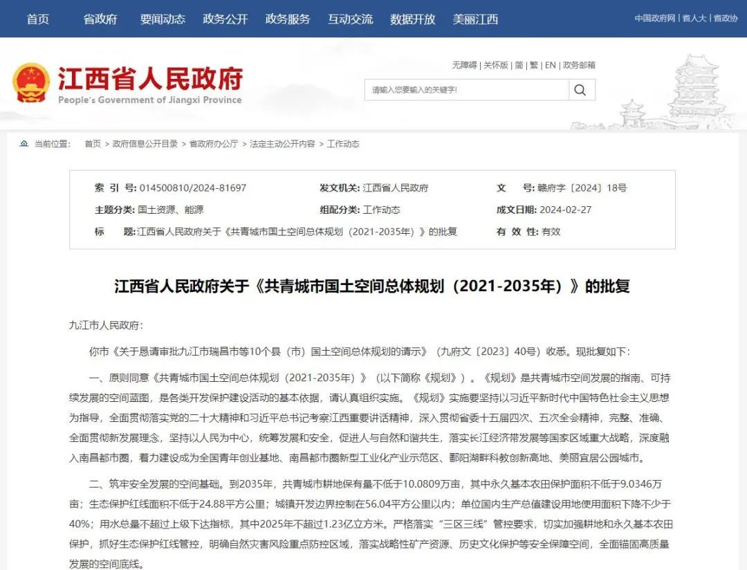 江西省人民政府关于《共青城市国土空间总体规划(2021-2035年)》的批复
