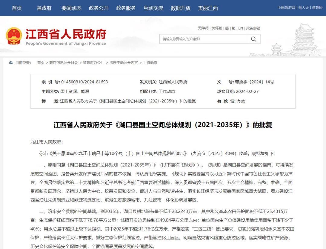 江西省人民政府关于《湖口县国土空间总体规划(2021-2035年)》的批复