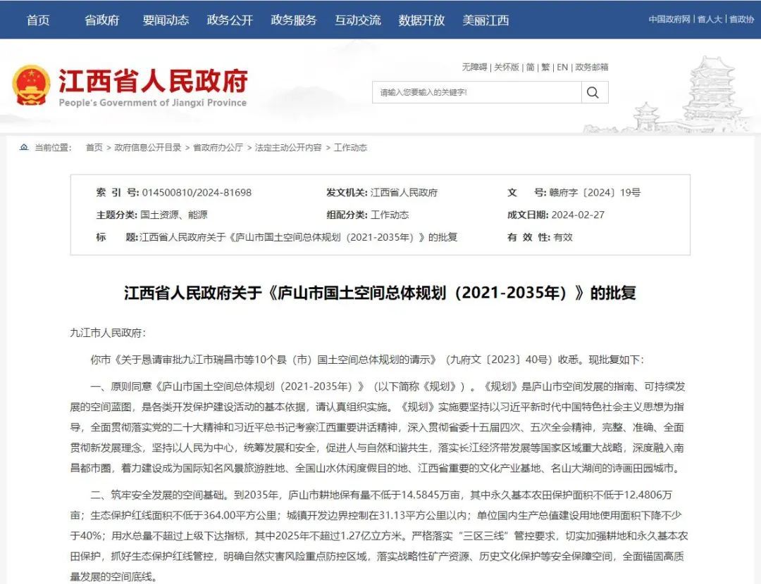 江西省人民政府关于《庐山市国土空间总体规划(2021-2035年)》的批复