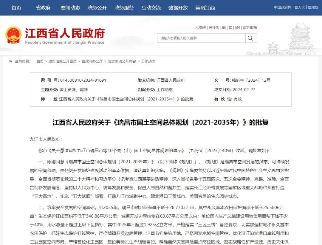 江西省人民政府关于《瑞昌市国土空间总体规划(2021-2035年)》的批复