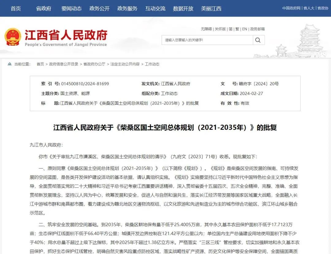 江西省人民政府关于《柴桑区国土空间总体规划(2021-2035年)》的批复