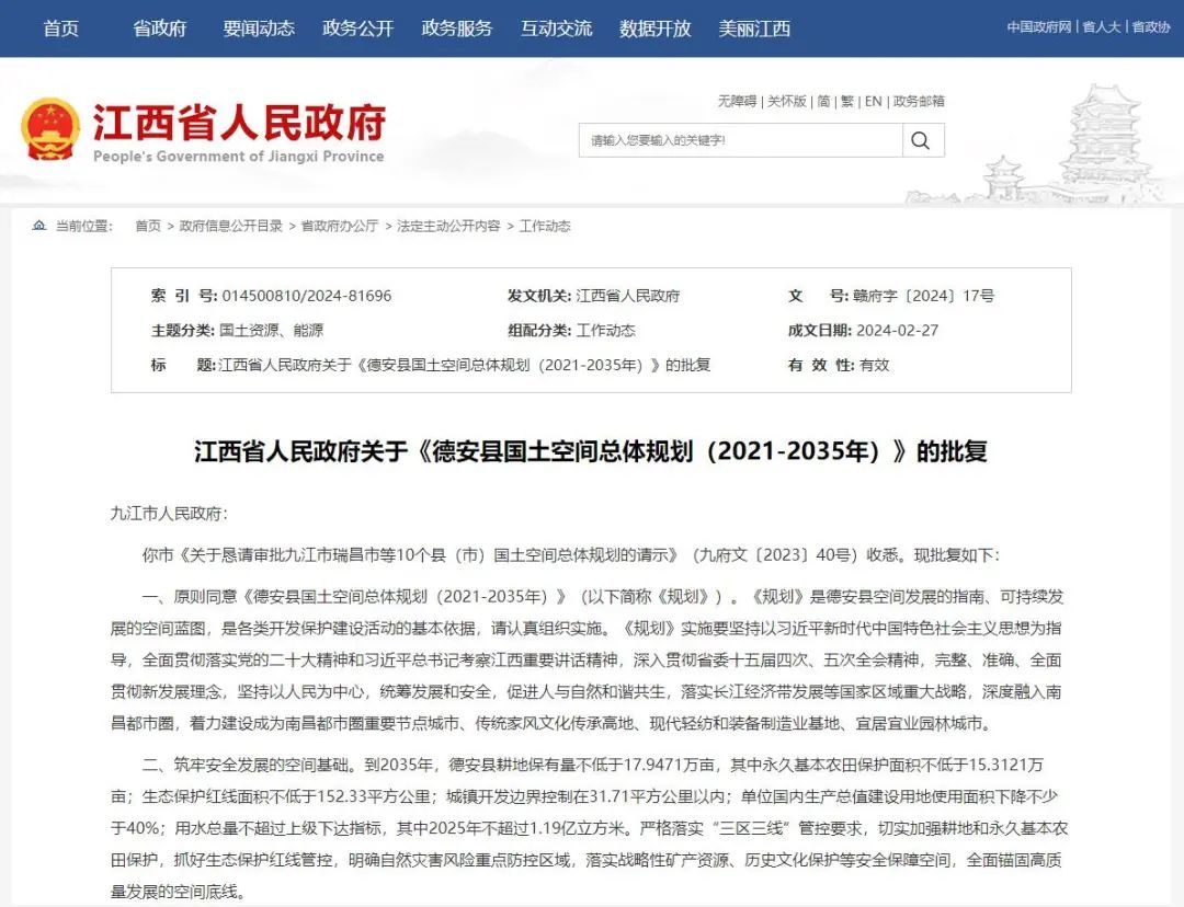 江西省人民政府关于《德安县国土空间总体规划(2021-2035年)》的批复