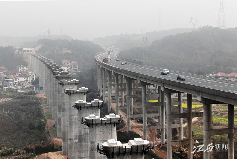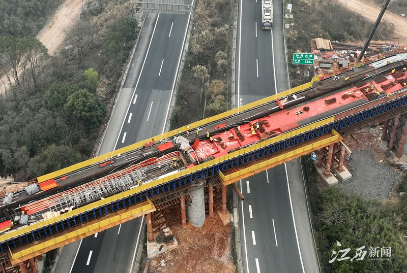3月15日,新建京港高铁九江至南昌段(简称昌九高铁)庐山桥梁群正在进行首次跨越杭瑞高速公路施工。当天,昌九高铁庐山桥梁群首次成功跨越杭瑞高速公路。