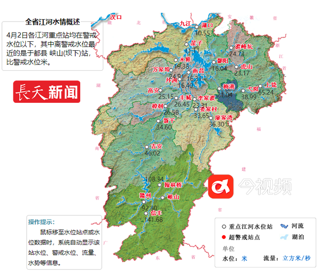 今视频客户端讯 4月2日16时55分,江西省水文监测中心发布洪水蓝色预警:受强降雨影响,预计未来19小时前后,修河干流永修县城河段将出现超警戒0.6米左右的洪水。
