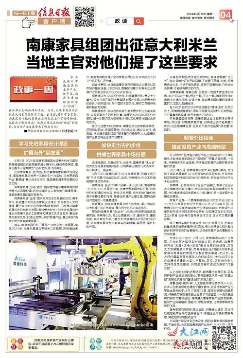 家具是赣州市南康区的主导产业。近年来,南康主官积极推动家具“出海”,在世界上打响品牌知名度。近日,南康家具组团出征意大利米兰国际家具展。出发前,赣州市委常委、南康区委书记何善锦在启程仪式上作了动员讲话。他提出了哪些要求?近期南康家具频频“出海”的背后,为当地产业发展带来了哪些变化?