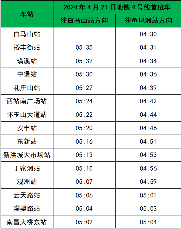 为配合做好2024南昌象湖半程马拉松运输服务保障,4月21日,地铁4号线首班车运营时间将提前1.5小时至4:30,提前运营时段行车间隔约10分钟,其他线路运营时间不变。具体首班车时刻表如下: