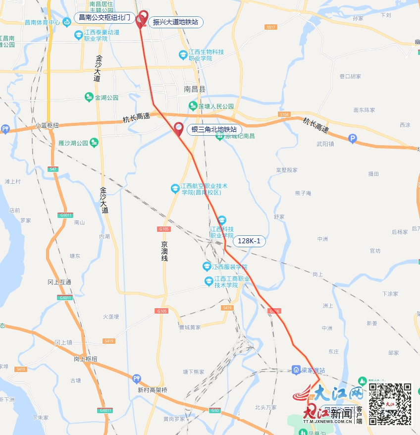 线路走向:昌南公交枢纽北门—复兴大道—莲塘大道—迎贤大道—蓝园大道—凤凰沟景区;