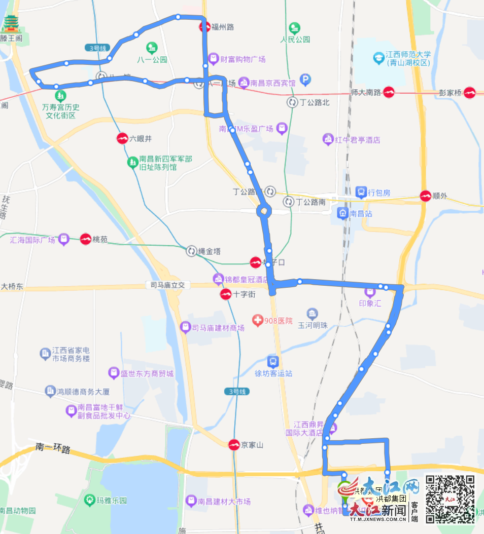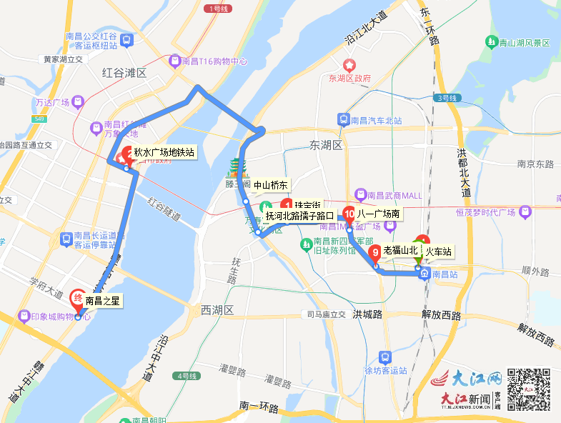 下行:南昌之星、秋水广场地铁站、中山桥东、万寿宫地铁站北、珠宝街、八一广场南、老福山北、火车站。