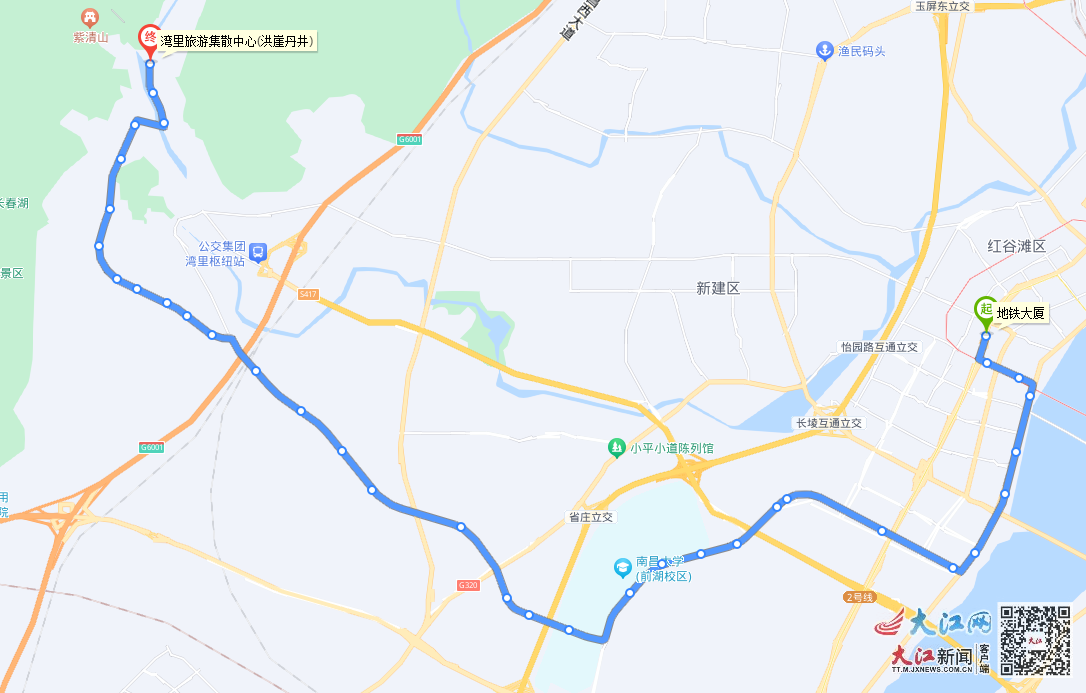 线路走向:湾里旅游集散中心—翠岩路—招贤大道—工农路—乐祖路—天宁西路—梅岭大道—嘉言路—学府大道—赣江中大道—世贸路—丰和中大道—地铁大厦;