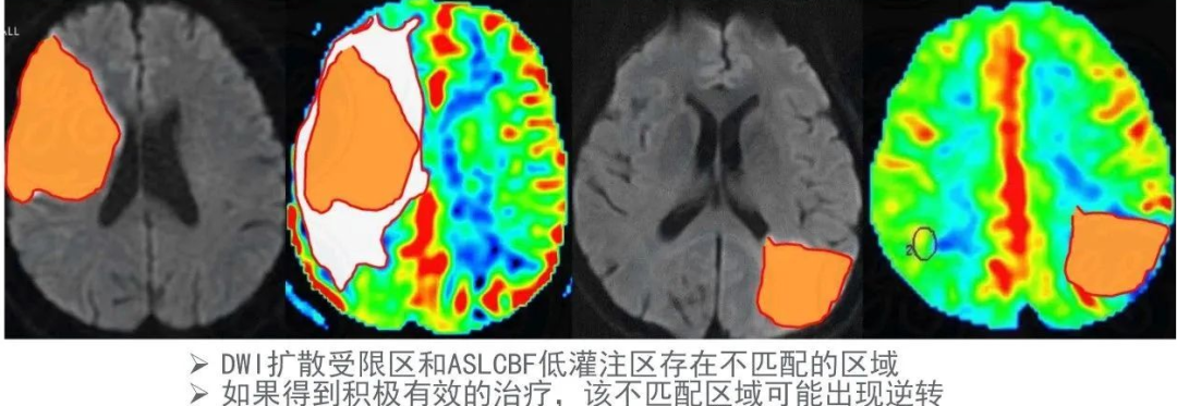 图片ASL显示缺血区域及低灌注区,DWI代表核心梗死区域,ASL-DWI=缺血半暗带