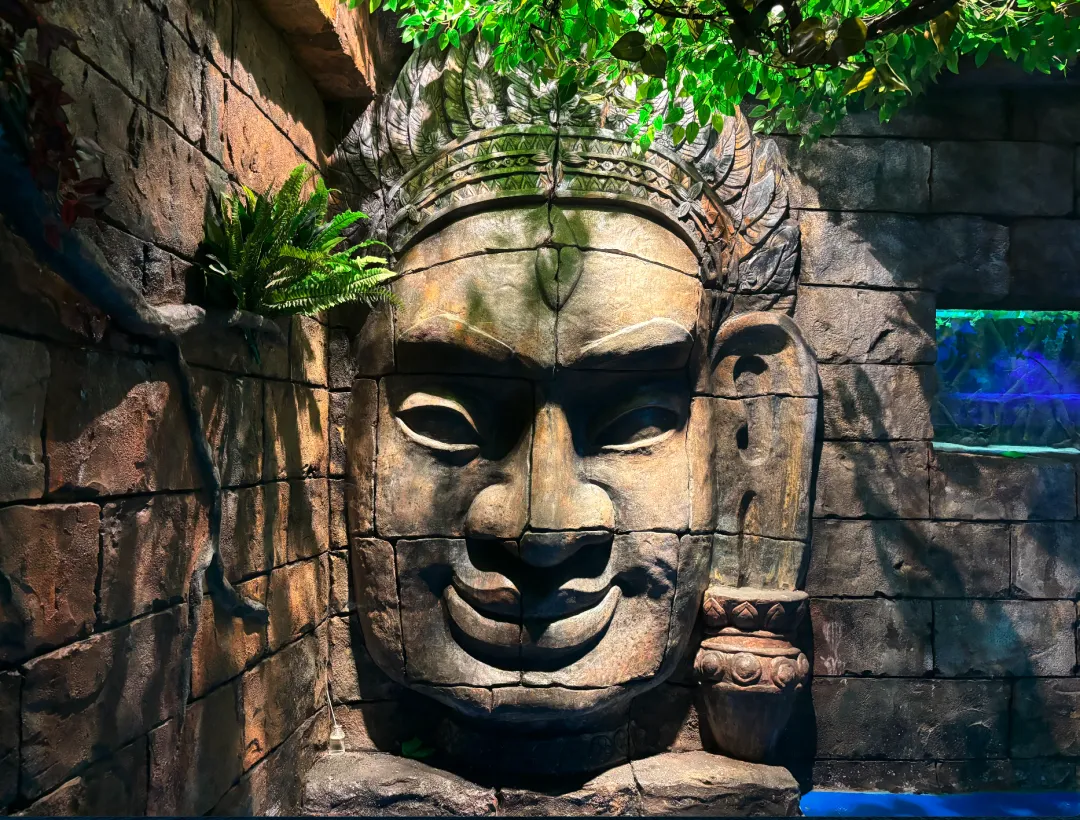 检票后左转来到我们的玛雅文明主题的莫哥窟系列造景,这里有世界两大微笑之谜其中之一的“高棉的微笑”、食人鱼、铅笔鱼胭脂鱼、巨骨舌鱼、虎头鲨等等新颖且让您频频驻足的鱼类。